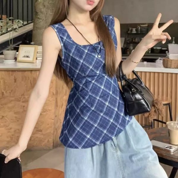 Mga review ng 2 para sa Blue Plaid hollow square collar top