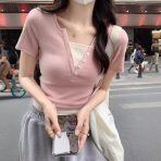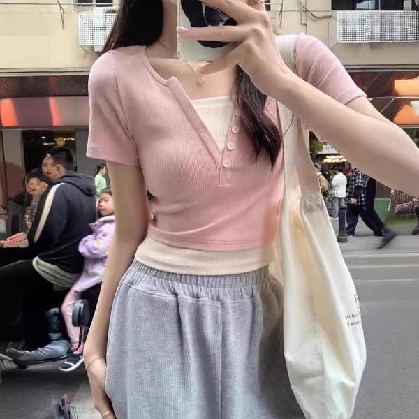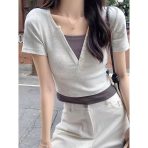 I absolutely love this Slim fit fake two-piece V-neck top! It fits me perfectly and the design is so stylish. It’s my new favorite go-to top for casual days and outings. Highly recommend!